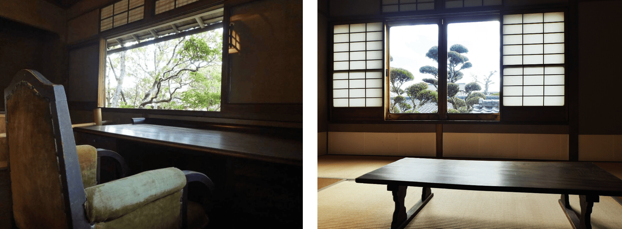 重厚な肘掛椅子を備えた1階北向きの書斎、『暗夜行路』は南向きの2階の一室で完成した