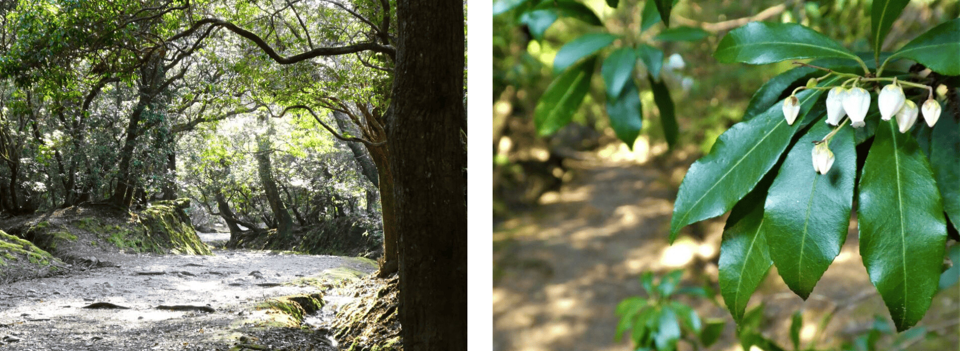旧居のすぐ北は、春日大社の二の鳥居につながる「下の禰宜道(しものねぎみち)」、通称「ささやきの小径(こみち)」の入口です。かつて神官たちが通った森の古道を、志賀直哉も好んで歩きました。2月から4月頃に咲く愛らしい馬酔木(あしび)の花が、100年前と変わらず木漏れ日にかがやきます。